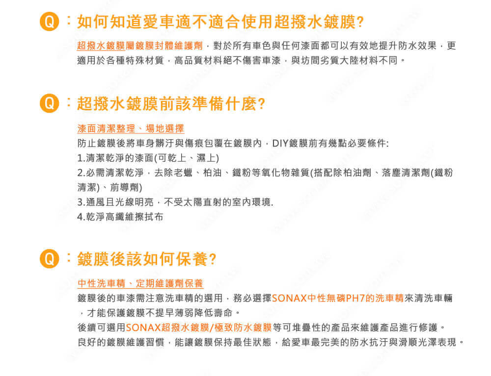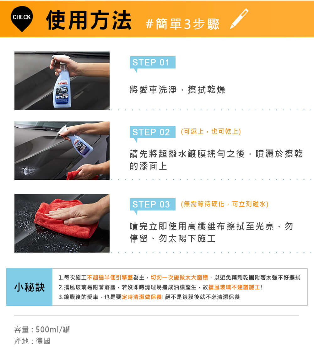使用前請先搖勻之後,噴灑於已清洗乾淨並擦乾的漆面隨即使用SONAX鍍膜美容巾擦亮即可。