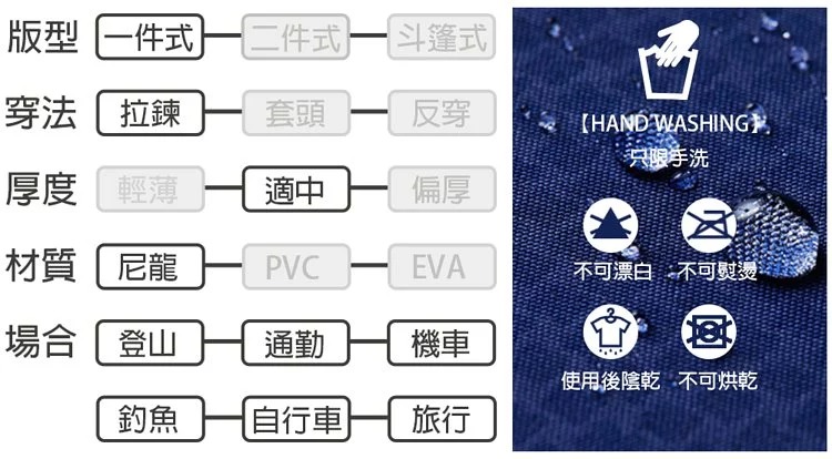 洗滌方式:限手洗 / 不可用甲苯等容器洗滌 / 不可熨燙 / 使用後陰乾 / 不可烘乾