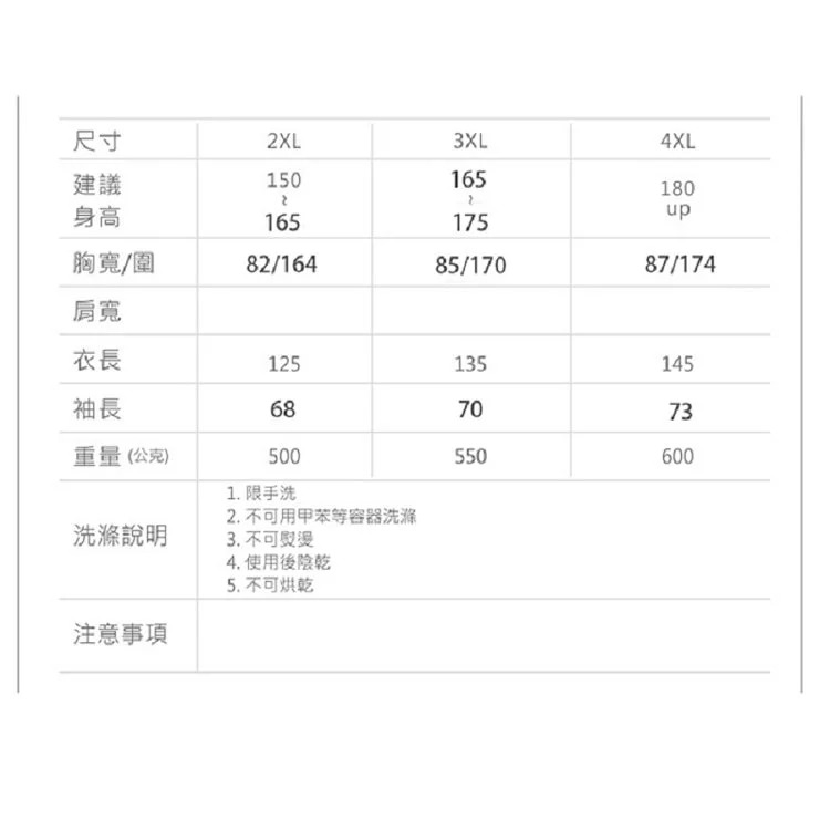 尺寸:2XL、3XL、4XL