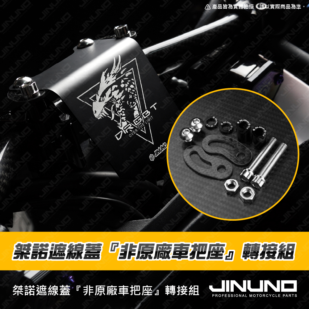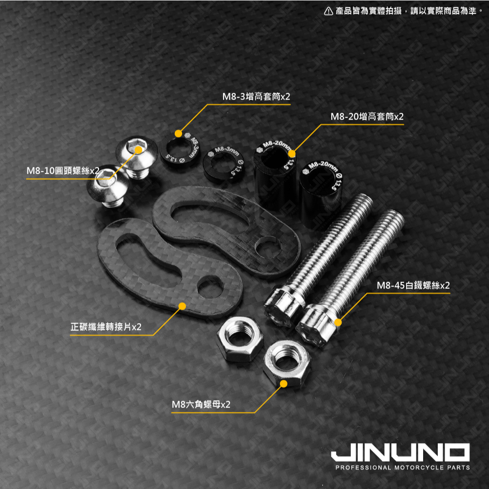 .內容物:碳纖維轉接片 × 2、M8-45白鐵螺絲 × 2、M8-10圓頭白鐵螺絲 × 2、M8白鐵螺母 × 2、M8-20增高套筒、M8-3增高套筒