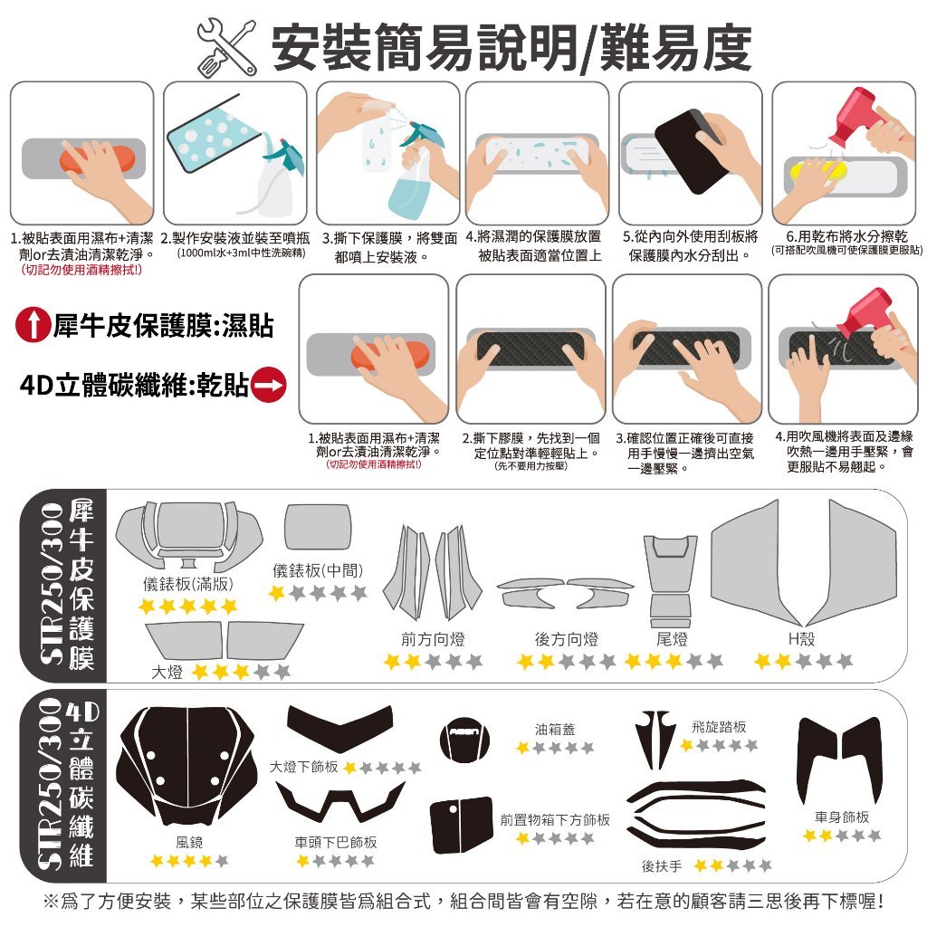 .安裝前請務必將被貼表面擦拭乾淨,以免灰塵留在保護膜內。(必要時可使用去漬油,但請先自行確認車體材質是否能使用)