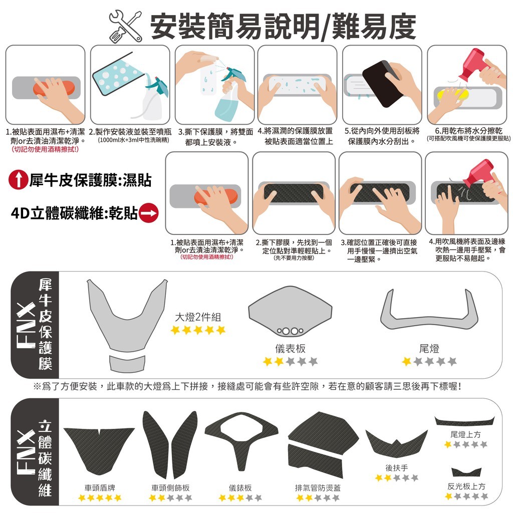.安裝前請務必將被貼表面擦拭乾淨,以免灰塵留在保護膜內。(必要時可使用去漬油,但請先自行確認車體材質是否能使用)